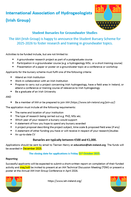 Successful applicants will be expected to submit a short written report on completion of their funded activity and may be invited to present at an IAH Technical Discussion Meeting (TDM) or present a poster at the Annual IAH (Irish Group) Conference.